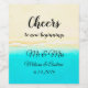 Étiquette de bouteille de vin de mariage personnalisée avec une jolie côte océanique, de l'eau sarcelle, une plage de sable qui dit "À votre santé" avec la date du mariage et les noms des mariés.