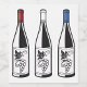 Illustration of three wine bottles, each with a different colored cap: red, white, and blue. The bottles are filled with a dark liquid, possibly wine, and each has a white label with a black outline. The labels feature a design of grapes and leaves with swirling tendrils. The style is simple and graphic, with bold outlines and flat colors.
