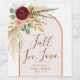 Élevez votre célébration d'automne avec cette élégante étiquette de bouteille de vin de la collection Fall in Love. Présentant un bouquet aquarellé peint à la main de chrysanthèmes bordeaux profond, de roses rose tendre, de feuilles d'automne dorées, d'herbe de la pampa séchée, de verdure d'eucalyptus sauge et de plumes de faisan rustiques, ce design dégage un charme chaleureux et romantique. Une arche terracotta rustique orange rouille de style bohème chic encadre l'œuvre d'art, ajoutant une touche occidentale sophistiquée. Parfaite pour les réceptions de mariage automnales, les douches nuptiales d'automne, les soirées de fiançailles, les dîners de répétition ou les événements rustiques de vignoble, cette étiquette habille instantanément vos bouteilles