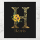 Beau monogramme de couple/famille avec une touche dramatique, représentant une lettre H décorée d'or avec un joli bouquet de tournesols à l'aquarelle, texte moderne doré personnalisable sur fond noir
