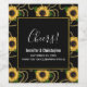 étiquette de bouteille mariage avec une motif élégante et élégante. Joli tournesol jaune et feuilles verts entourés de fines chaînes d'or. Arrière - plan noir. Un carré noir avec une fausse bordure en feuille d'or superposée avec un texte personnalisé à l'intérieur.