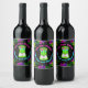 Vin sur mesure unique à thème île ou bouteille de vin pétillant étiquette pour une douche d'couple colorée, avec un masque tiki en vert sur un arrière - plan tropical hawaïen en bleu clair, rose et vert sur noir, imprimé avec vos noms.