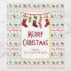 Un étiquette de vin/bière avec un motif répétitif dans l'arrière - plan, dans un style de pull de Noël moche. Le motif est composé de chaussettes, boules de noël, étoiles et flocons de neige. Avec le texte Joyeux Noël en rouge. Amusant et festif. Disposé sur le dessus est un rectangle blanc avec une fausse bordure de feuille d'or, à l'intérieur est une illustration de bas suspendus à l'ancienne. Joyeux Noël et votre texte personnalisé à l'intérieur. Tout le texte est modifiable.