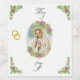 Design présente une belle image de Notre Dame de Fatima comme un ovale au centre. Image de roses délicates roses et blanches formant un cadre. Les initiales de la mariée et de la chambre sont affichées en haut avec le monogramme du nom de famille représenté en bas. L'image des anneaux de mariage dorés unis est affichée ci-dessous et à gauche d'ovale. Les angles supérieurs gauche et inférieur droit sont les images de roses et de verdure. Conçu pour coordonner avec la "Suite Mariage catholique Vierge Marie".