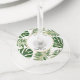 Tags en verre de vin rond feuille vert et or mariage tropical. Un joli design mettant en vedette les feuilles de Split Leaf Philodendron (Monstera deliciosa) ou Plante de fromage suisse et feuilles de palme en vert avec contour d'or. Votre texte est dans un cadre blanc avec contour doré. Choisissez-le pour votre plage tropicale côtière ou mariage de destination. L'arrière comprend un motif à pois dorés sur vert foncé.