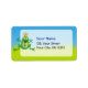 Caricature de la grenouille Prince avec couronne sur herbe verte sous ciel bleu. Champs de texte personnalisés pour le nom et l'adresse.