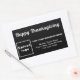 L'autocollant Thanksgiving pour saluer vos clients. Sticker que vous pouvez utiliser comme matériel de marketing pour annoncer votre entreprise et promouvoir votre marque. Sticker avec salutation d'action de grâces et avec votre nom d'entreprise pour construire la sensibilisation de marque. Vous pouvez également l'utiliser comme étiquette de produit cette saison d'action de grâce. La forme de l'autocollant est un rectangle. Le design Sticker est une simple police blanche sur arrière - plan noir. Pour customiser cet autocollant, téléchargez votre logo d'entreprise, tapez votre nom d'entreprise ou d'entreprise, votre adresse et votre numéro de téléphone, puis vérifiez l'apparence. Si l'apparence vous plaît, vous pouvez passer votre commande maintenant. Si vous avez besoin de redimensionner et déplacer le logo et les textes pour tenir sur cet autocollant ou sur d'autres formes et tailles que vous choisirez, s'il vous plaît changer dans l'outil de conception. Vous pouvez également effectuer d'autres modifications selon vos préférences dans l'outil de conception, comme changer la couleur de l'autocollant, la couleur de police et le style de police. BON THANKSGIVING !