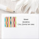Ces étiquettes d'adresse de retour ont un design moderne du milieu du siècle de lignes verticales de rectangles arrondis de taille croissante et décroissante dans les couleurs rétro de rouge, vert, bleu, jaune, orange et marron sur un champ de blanc.