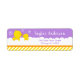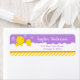 An adorable yellow duck and duckling in white soapy bath bubbles on a bright purple background with an orange ribbon and yellow stripes.