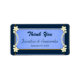 © Sunny Mars Designs. Merci Mariage Floral bleu rustique Favor Étiquettes - Personnalisable moyen formel personnalisé vintage bleu rouillé élégant mariage faveur étiquettes avec bordure ruban bleu foncé, jolies fleurs blanches modernes contre arrière - plan papier parchemin bleu ancien.