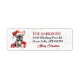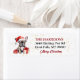 Le côté gauche de ces étiquettes d'adresse de retour de vacances amusantes est illustré d'une image d'un adorable chiot français Bulldog portant un chapeau de Père Noël rouge et blanc et assis à côté des cadeaux de Noël emballés. Votre texte personnalisé est en rouge et noir à droite. Un subtil arrière - plan de confettis d'or donne un peu d'éclat de Noël.