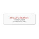 Cette étiquette de adresse intemporelle allie simplicité et élégance à une palette rouge, blanche et noire épurée. Un script manuscrit moderne met en évidence votre nom en rouge gras, tandis que l'adresse est définie dans la typographie noire classique pour une lisibilité sans effort. Personnalisez à la fois le nom manuscrit et le texte noir croustillant pour en faire le vôtre unique, le tout dressé contre un arrière - plan blanc immaculé.