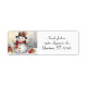 Un très mignon bonhomme de neige dans un casquette noir avec une grosse fleur et un foulard rouge se dresse dans un terrain enneigé avec des arbres et de grandes fleurs. Étiquette de adresse de vacances plein de charme !