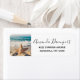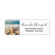 Étiquettes de adresse avec une photo pittoresque. Une grande étoile de mer dressée sur une plage de sable. Une belle mer bleue avec des vagues de surf blanc en arrière - plan.