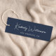 Vêtements et accessoires élégants et chics sur mesure, bijoux, boutique, etc., étiquette suspendue bleue avec une esthétique minimaliste présentant votre nom ou marque dans un script de signature stylé blanc. Ajoutez du texte supplémentaire en dessous et au dos en typographie blanche moderne simple. Veuillez noter que Zazzle ne perce pas le trou et ne fournit pas de ficelle.