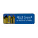 Illustration urbaine des bâtiments de la ville avec un arrière - plan bleu du soir. Personnalisez ce étiquette avec votre nom ou adresse. Pour changer l'arrière - plan bleu en une autre couleur, cliquez sur Customiser.