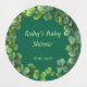 Des trèfles verts peints autour d'un arrière - plan vert. Le texte est blanc avec un contour vert et une ombre verte plus claire comme un baby shower entièrement personnalisable pour une mère.