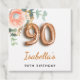 Pour une soirée élégante et féminine de 90ème anniversaire. Un arrière - plan blanc chic. A l'avant : Décoré d'or rose et de fleurs roses rose vif, fleuris, feuilles d'eucalyptus verts, sprigs, verdure et sprigs faux or. Personnalisez et un nom. Lettres noires et dorées. Le nom est écrit avec un script de style moderne écrit à la main. Le numéro 90 est écrit avec une police de style ballon doré. Retour : floraux et votre remerciement note, nom.