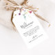 Ces étiquettes-cadeaux de bienvenue aux fleurs sauvages et colorées sont parfaites pour un mariage rustique. Le design présente des fleurs sauvages jaunes, violettes et blanches avec du feuillage dans un arrière - plan rose et vert aquarelle. Ces étiquettes sont parfaites pour les sacs de bienvenue des clients de l'hôtel et les mariages de destination.