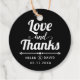 Love and Thanks élégant et moderne noir et blanc typographie mariage Favor Tags. Une élégante marque de faveur avec l'expression "Amour et Merci" dans un style typographique audacieux en couleur blanche, un séparateur blanc et vos noms.