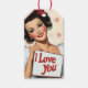 Illustration dynamique dans le style pin-up classique des années 1950. L'image présente une femme glamour aux boucles vintages, au maquillage audacieux et au sourire radieux. Elle tient une pancarte avec un message d'amour, "Je t'aime", sur fond de roses roses délicates et roses. L'esthétique générale capte l'atmosphère romantique et ludique de l'art pin-up du milieu du siècle.