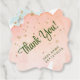Style calligraphie "Merci" en vert de forêt sur une tache d'eau rose pêche. Effet doré scintille et espace personnalisé pour votre nom et votre date. Reverse à pulvérisation de mouchards d'or.