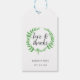 Ces étiquettes de cadeaux botaniques pour vos faveurs de mariage comportent une colère de feuillage vert aquarelle avec votre message dans la police de caractères de calligraphie et vos noms et date mariage le long du fond. Balises inversées à vert solide.