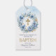 Photo moderne, élégante Baptême merci tags. L'étiquette comporte un script de typographie ''Baptême'' en lettres majuscules or, une couronne fleurie bleue et or avec croix d'or sur une aquarelle arrière - plan bleu poussiéreux. Personnalisez encore plus avec un nom, une date et une photo au dos.