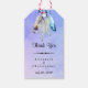 Un mariage à thème tribal / indigène américain merci tag cadeau. Un design aquarelle avec quatre plumes délicates et douces perlées ensemble accrochées à la bordure supérieure. L'arrière - plan est une douce texture d'aquarelle bleu violet. Un motif tribal avec un thème de style amérindien. Personnalisez avec vos détails. Un séparateur de ligne sophistiqué est placé entre le texte de remerciement et vos informations personnalisées.