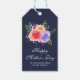 Des étiquettes-cadeaux avec les mots : Bonne fête des mères. À la meilleure maman du monde. Texte modifiable / modifiable. Conçu avec un joli bouquet de roses aquarelles avec des sprigs, des feuilles et des branches, le tout dans un agencement fleuri coloré. Arrière - plan bleu marine.