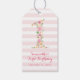 Aquarelle Floral One First Birthday // Fleurs roses, coraux et jaunes avec feuilles verts en forme du numéro UN et rayures roses dans l'arrière - plan. Pois sur le dos de l'étiquette cadeau. Vous pouvez utiliser cette balise pour le présent ou modifier le texte et l'utiliser pour les balises de préférence de partie. Personnalisez avec le nom et la date d'anniversaire. Pour toute question sur les changements de conception personnalisés par le concepteur indépendant, veuillez envoyer un courriel à paula@labellarue.com AVANT de customiser ou de passer une commande.