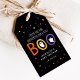 Baby shower sur le thème de l'Halloween très mignon, avec l'expression "Merci pour arroser notre petit boo" en lettres à la main orange, jaune et violet avec des fantômes blancs sur un arrière - plan noir. Des étoiles et des points colorés entourent le design. Personnalisez les étiquettes de faveur du baby shower Halloween avec le nom de la future mère et la date de la douche. La balise de faveur inverse pour afficher un motif étoile correspondant.