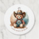 Ajoutez une charmante touche occidentale à vos faveurs de baby shower avec cette étiquette Little Cowboy Baby shower Favor ! Doté d'un adorable ours en peluche cowboy habillé de plaid et de denim, ce tag rond capture la chaleur rustique du Far West. La douce couleur Mocha Mousse de l'année se marie magnifiquement avec des tons bleu poussiéreux et brun chaleureux dans le désert pour un look cosy et champêtre. Parfait pour attacher des sacs à gâteaux, des mini bocaux de mason ou des faveurs casquettes de cowboy, ce tag apporte une touche de finition délicieuse à votre célébration à thème occidental !
