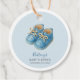 Tiny kicks baby shower theme featuring baby sneaker shoes on a pastel blue background. A minimalist modern baby shower theme for gender neutral baby celebrations. You can easily personalize this with your details.
