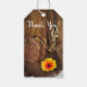 Merci à vos invités d'avoir fait partie de votre fiançailles, douche nuptiale ou mariage informel mais élégant lorsque vous joignez les Boots rustiques Cowboy, Daisy et Horse Bit Mariage campagnard Favor Tag à leur faveur de fête ou petit cadeau. Ces étiquettes spéciales mariage à thème équestre personnalisées décontractées comportent une photo florale pittoresque d'une paire de bottes de cowboy, fleur de marguerite orange et jaune, collier de perles blanches, chevreuils et robes en cuir avec un arrière - plan en bois de grange patiné marron.