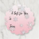 Chouettes adorables assis sur une branche en train de boucher avec de jolis flocons de neige et arrière - plan rose, étiquette cadeau pour vos cadeaux de Noël de vacances.