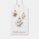 Une étiquette-cadeau de Noël rustique et moderne en aquarelle terreuse avec des ornements de Noël, des cônes collants et de pin accrochés à une branche rustique, avec la phrase : "c'est la saison". Une étiquette cadeau de vacances de style rustique et neutre.