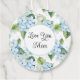 Cette étiquette cadeau est présentée en forme ronde avec une belle impression florale d'hydrangée bleue. Texte : Love You Mom Customisez cet article ou achetez tel quel.