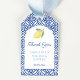 Le thème Citrus privilégie le design de tag avec un citron simple minimaliste avec une forme d'arc de tendance, le tout contre un imprimé carrelage blanc et bleu antique. Montré ici pour une Mariée / Wedding shower mais tout le texte peut être customisé à votre événement.
