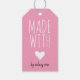 Balises pendantes roses pour vos articles faits main où vous pouvez ajouter votre nom et instructions de lavage. Fabriqué avec amour est écrit dans une grande police manuscrite où un coeur blanc griffé remplace le mot amour. Votre nom dans un charmant script noir.