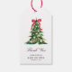 Élégante étiquette cadeau de baby shower avec un petit arbre de Noël mignon décoré de coquette rouge.