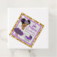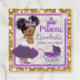 Princesse Royale Africaine en violet et lavande avec une bordure de Parties scintillant d'or. African American Princess avec adorable queue de paille afro en mauve et en tutu lavande, ornée d'une rose blanche ; sur un arrière - plan de parties scintillant blanche fleurie et dorée. Couronne pourpre et poussette bébé. Idéal pour un baby shower ou une fête d'anniversaire à thème princesse. Customisez avec le nom du bébé. ©2022 Miss Sassy Party Designs
