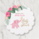 Super mignon éléphant rose avec des gouttes d'eau qui sortent de son coffre. Des fleurs de jungle rose et crème ornent le bord avec des feuilles de palmiers verts et des fougères molles. Idéal pour les baby showers à thème animal, safari ou jungle.