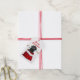 Sur le devant de cette étiquette cadeau de Noël est l'image d'un chien de chiot Labradoodle noir dans un sac cadeau de Noël rouge et blanc. Derrière le chien se trouve une série de lumières colorées de Noël. Le texte en haut dit "Joyeux Noël". Le dos de la balise répète l'image des lumières de Fêtes, avec des champs de texte en rouge pour vous permettre de customiser.