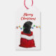 Sur le devant de cette étiquette cadeau de vacances est l'image d'un beau chien Black Labrador Retriever dans un sac cadeau de Noël rouge et blanc. Derrière le chien se trouve une série de lumières colorées de Noël. Le texte en haut dit "Joyeux Noël". Le dos de la balise répète l'image des lumières de Fêtes, avec des champs de texte en rouge pour vous permettre de customiser.