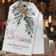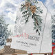Un arrière - plan de bois glacé à l'aquarelle avec des gros plans de flocs de neige peints en détail et des branches de genièvre fraîchement coupées et des cônes de pin, met en valeur cette étiquette cadeau de Joyeux Noël qui comprend un nom et une option de date/année.