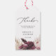 Ces pampas herbe boho vous remercier de bons cadeaux étiquettes sont parfaits pour un mariage d'été. L'aquarelle fleurie présente des fleurs bohèmes bordeaux et roses rousses avec des sprigs de pampa neutres et des feuilles de palmiers séchés dorés. Personnalisez les étiquettes avec vos noms et la date. Changez le libellé pour convenir à tout événement : douche nuptiale, dîner de répétition, baby shower et plus !