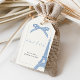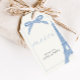 Dites merci beaucoup dans le style avec ce baby shower élégant d'inspiration française merci de préférence tag. Avec ses tons bleu poussiéreux doux, son illustration délicate de la Tour Eiffel et son écriture gracieuse, ce design se marie parfaitement avec toute célébration parisienne ou coquette. Le dos présente un motif rayé bleu et crème assorti pour un look boutique poli et coquette.