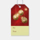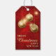 Des ampoules d'arbre motif en or brillant sont la caractéristique à l'avant de ces élégantes étiquettes cadeaux Holiday. Les images scintillantes sont placées sur un arrière - plan rouge profond abstrait avec des morceaux de confettis de parties scintillant d'or. Le bas contient du texte en or personnalisé qui dit actuellement "MERRY CHRISTMAS HAPPY NEW YEAR". L'arrière de la balise a la même image avec une bordure inférieure or pâle et un autre champ de texte. Élégant !
