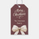 Un arrière - plan brun café muet, texte crème et arc. Joyeux Noël est écrit avec un élégant script de style manuscrit. Personnalisez et ajoutez votre nom de famille.